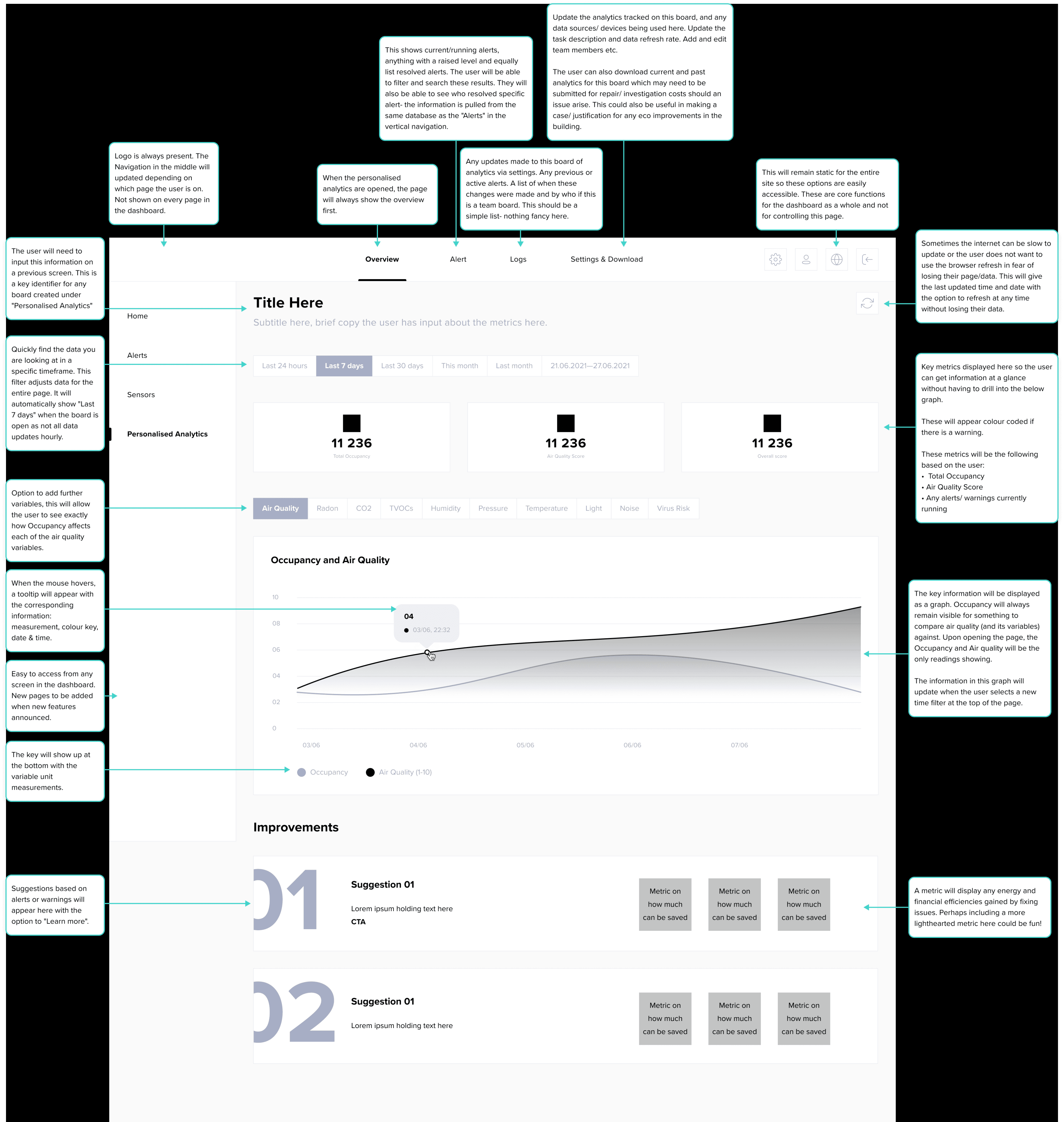 I designed a dual layered graph overlaying occupancy and air quality trends, with alerts highlighting critical changes. Filters allowed users to focus on key metrics like CO2 or virus risk, while a responsive design ensured usability across devices.